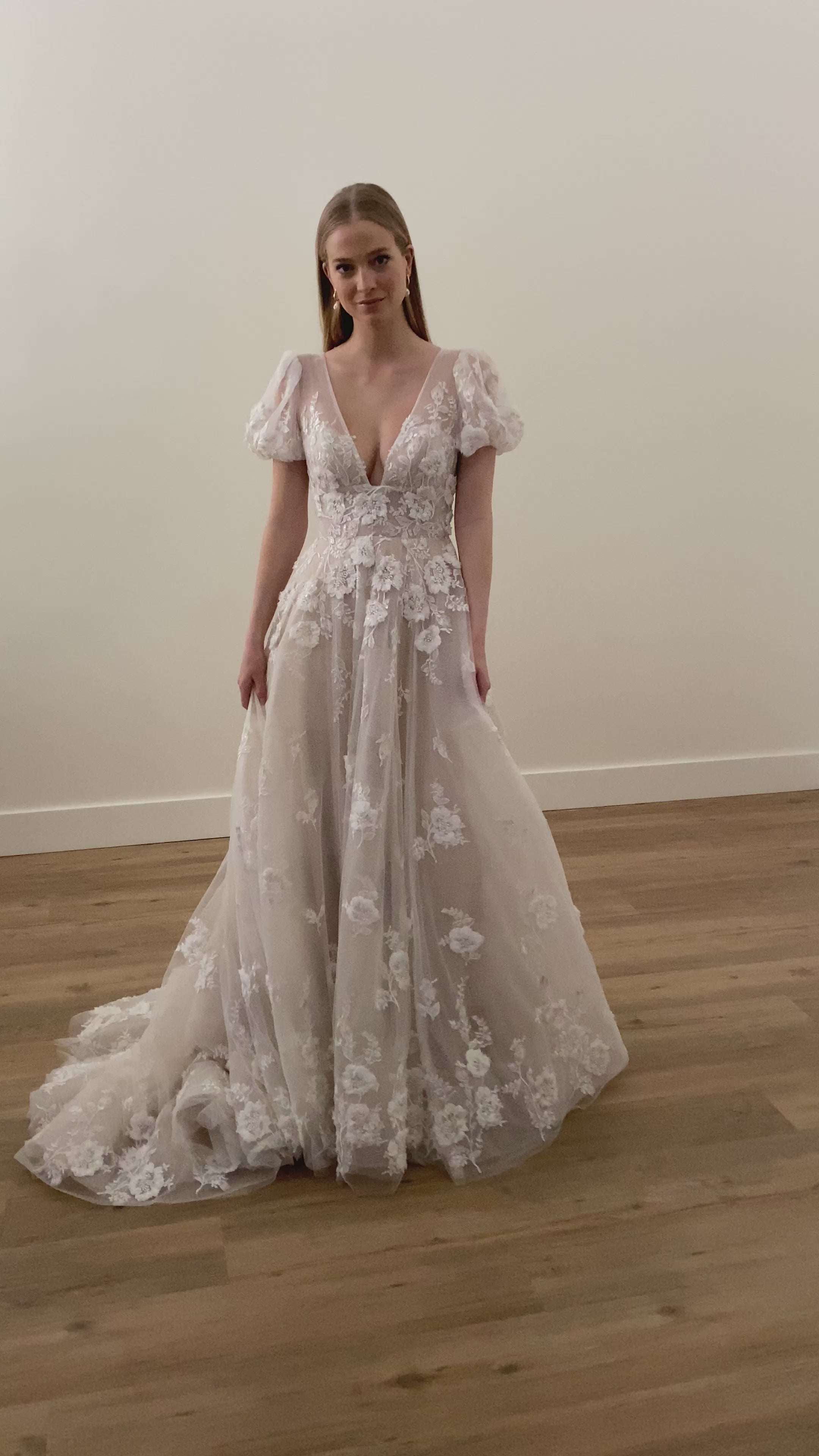 This ballgown wedding dress is simply one of the most romantic wedding dresses we have seen 🤍 The floral details on this puff sleeve wedding dress add so much wonder and that boho wedding dress feel. Guinevere's deep V neckline and thick waistband give a wonderful shape! This blush wedding dress can also be ordered in all ivory.
