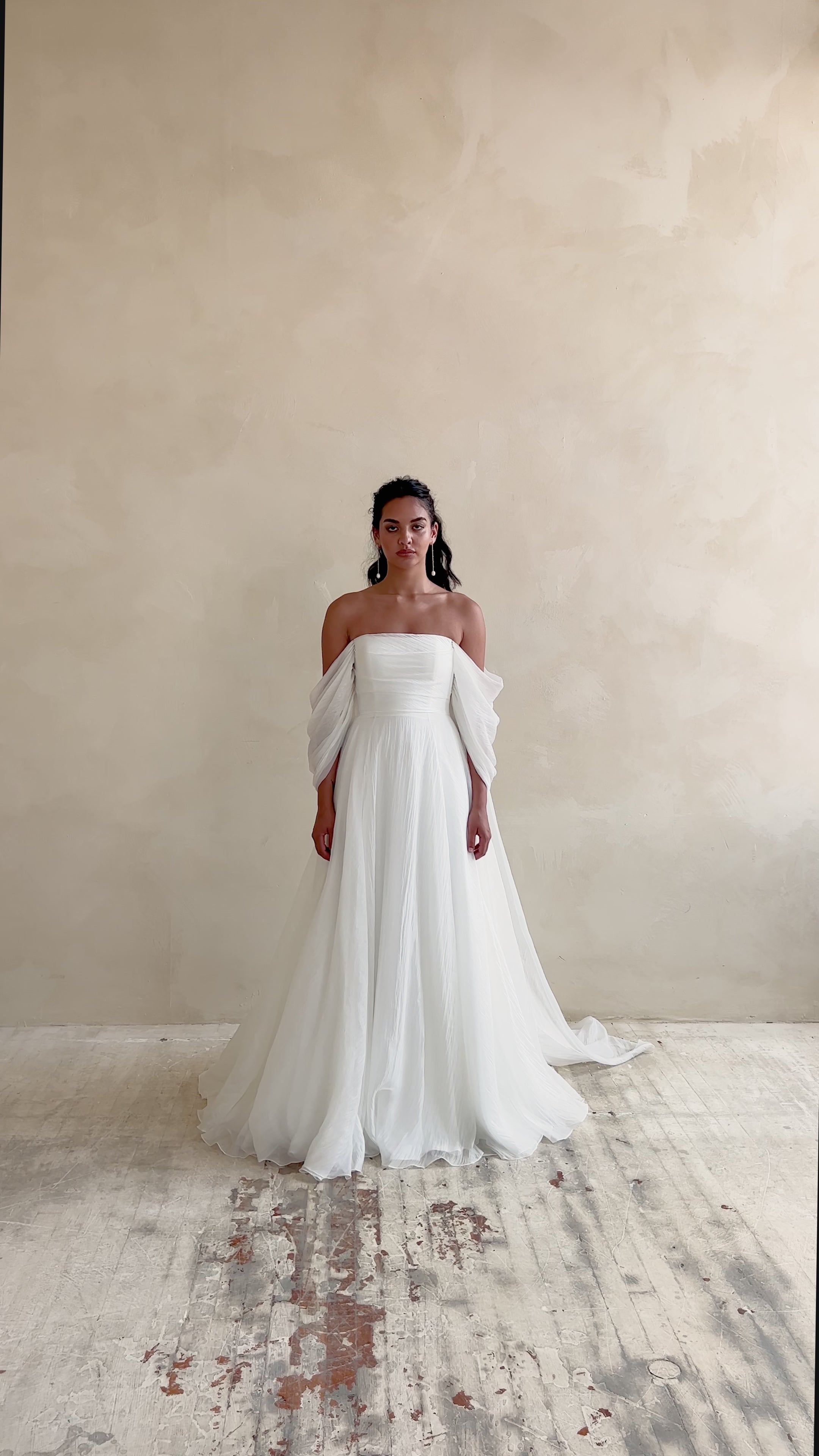 When you want romance, within a light and flowy wedding dress! The Noa gown, made with beautifully shimmery iridescent chiffon, is a perfect blend of whimsical wedding dress and classic wedding dress. The clean lines of the straight neckline are balanced by the dramatic sleeves that fall elegantly off the shoulders. We know some of our brides love to have different looks in one, and this detachable cape wedding dress give just that ♡