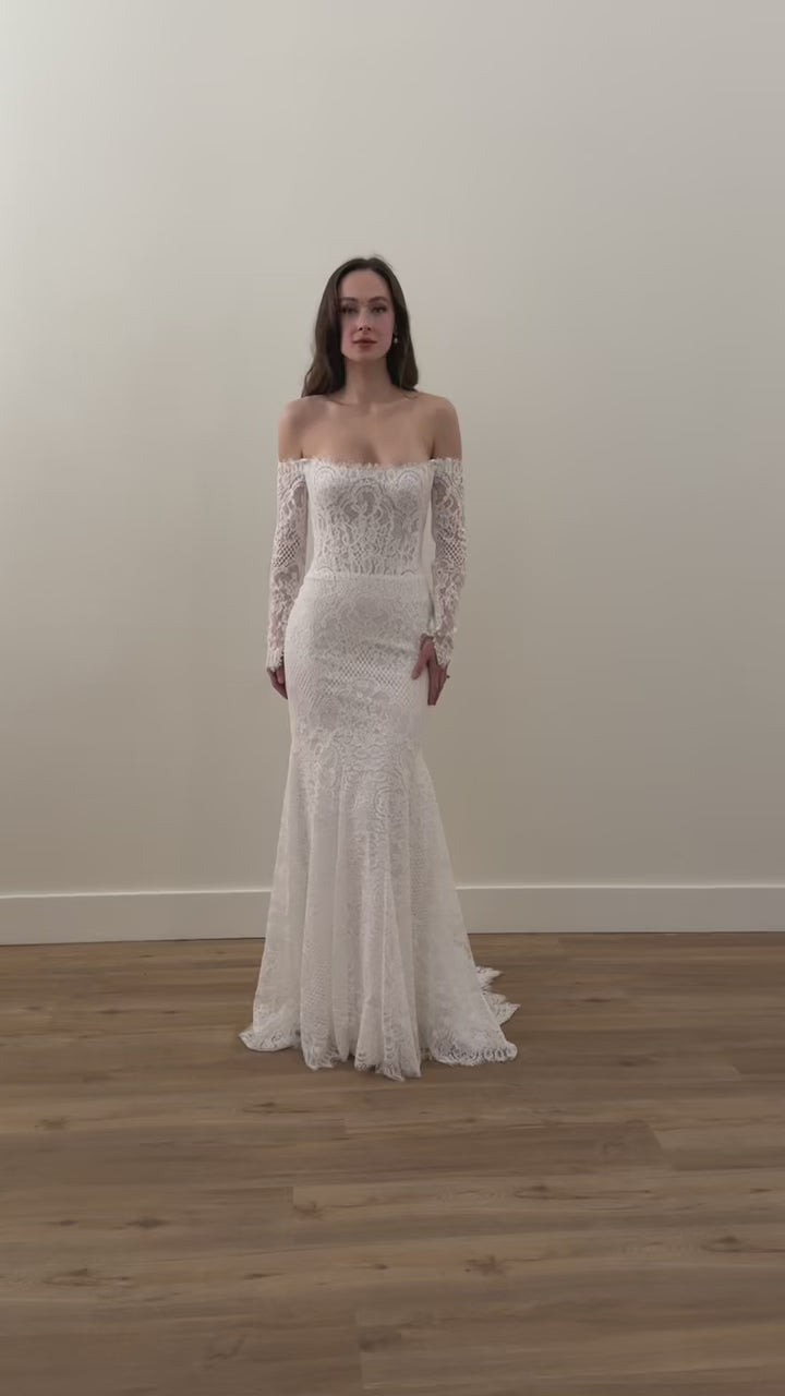 We adore this romantic streamlined lace gown, which is modern but timeless. An off the shoulder wedding dress, with amazing hidden structure beneath! If a long sleeve wedding dress suits your style, these sheer lace sleeves along with the illusion lace back detail really add those unique elements that make Resa pop ♡