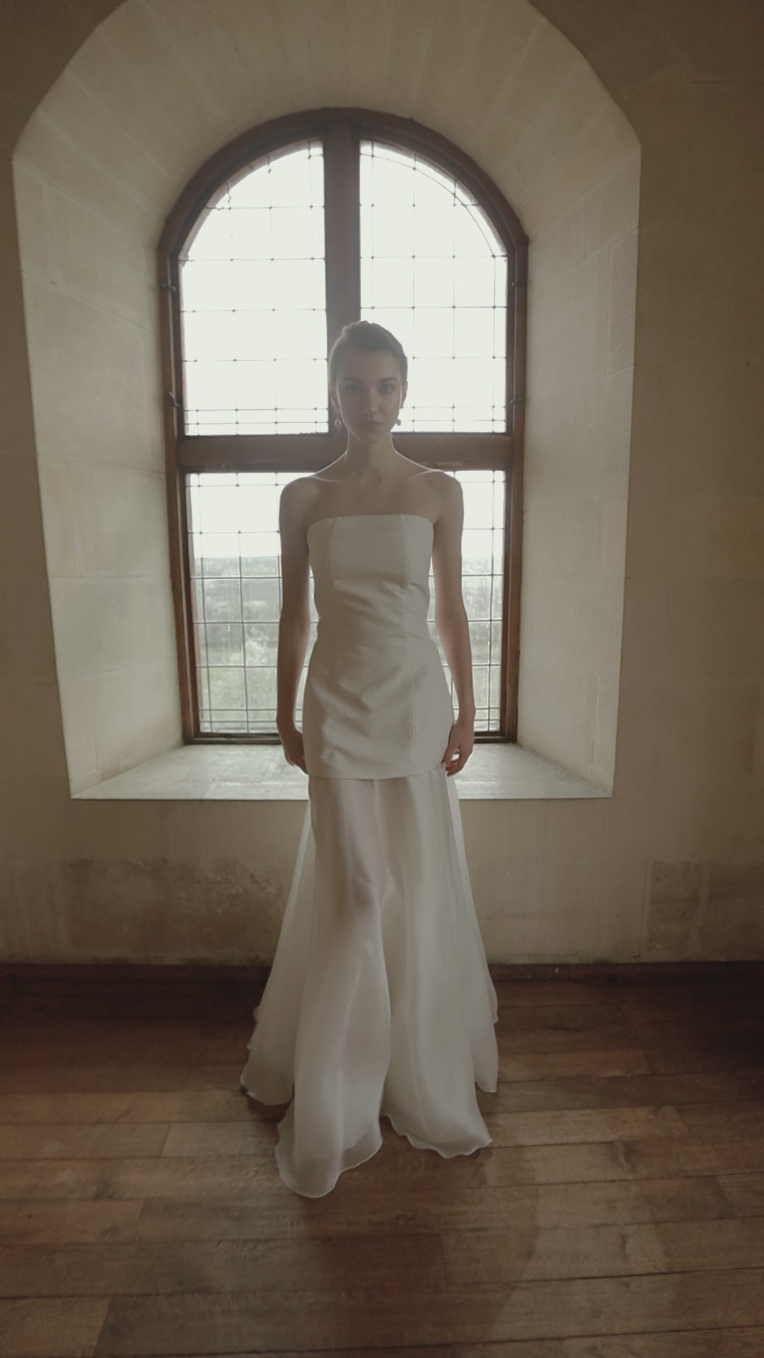 A mini wedding dress, combined with a structured corset and a fluid silk skirt, this is a luxurious modern wedding dress.